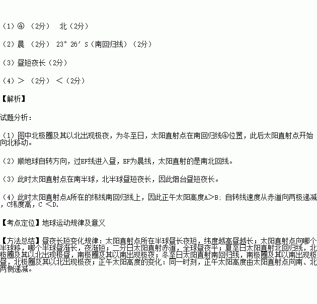 (1)左图所示日期太阳直射点位于右图中 (填数字①②③④)位置,此日后太阳直射点开始向 (填南或北)移动。(4分)