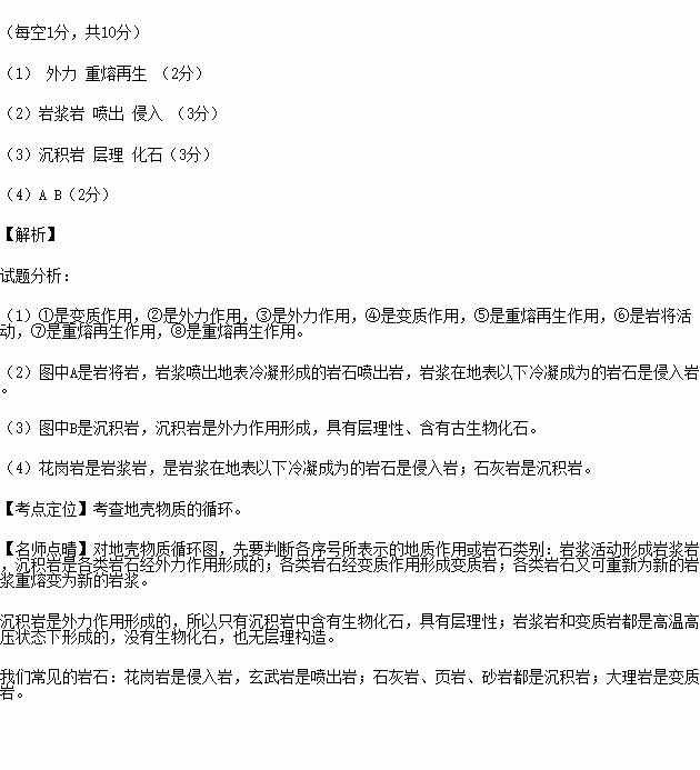 (2)A所属的岩石类型是 ,其中岩浆喷出地表冷凝形成的岩石叫________岩,岩浆在地表以下冷凝成为的岩石叫________岩。