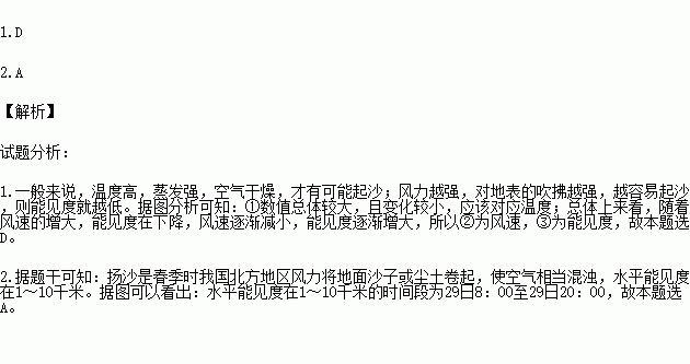 扬沙是春季时我国北方地区风力将地面沙子或尘土卷起,使空气相当混浊,水平能见度在1~10千米。读2011年4月28日至30日我国北方某次扬沙天气过程温度(℃)、能见度(km)和风速(m/s)变化曲线图,回答下列各题。
