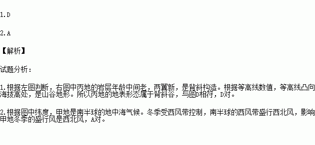 下右图为世界某区域等高线地形图;下左图为丙区域的放大图,实线为等高线(单位:米),虚线为地层界线。据此回答下列各题。