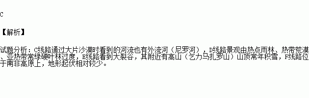 下图为某大洲轮廓示意图, 沿图中C、D、E、F沿线旅游(虚线为旅游线路,箭头表示行进方向),以下叙述正确的是