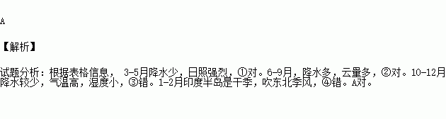 印度半岛受季风影响,降水空间分布很不均衡。下表为印度半岛某都市的气候统计资料,据此回答问题。