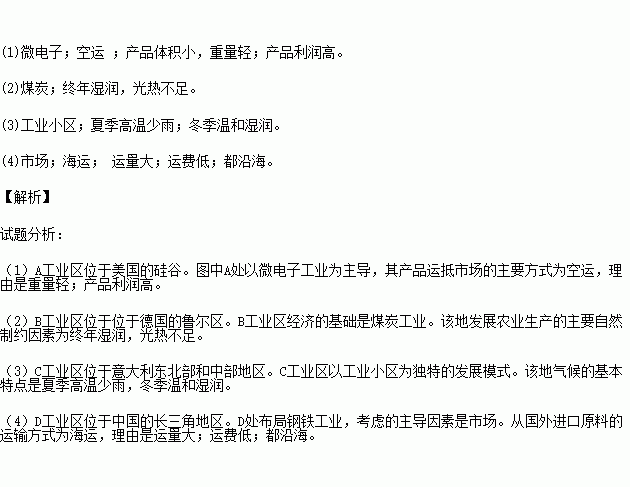 (1)图中A处以________工业为主导,其产品运抵市场的主要方式为__________,理由是_____________________________。