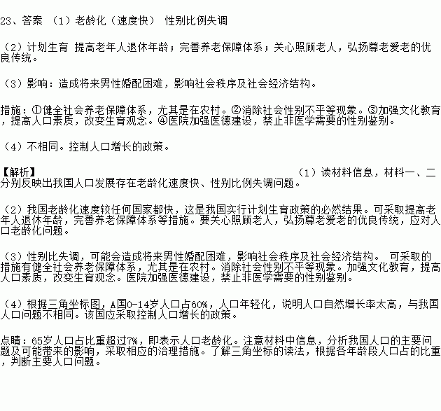 (4)读下面三角形坐标图,其中X、Y、Z分别表示某国0~14岁、15~64岁、65岁及以上三个年龄段人数所占总人口的比重,那么图中A点代表的国家所存在的人口问题是否与我国相同?该国所应采取的人口政策是什么?