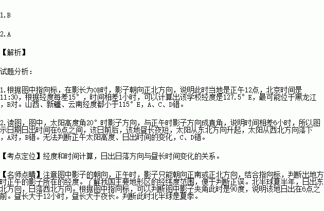 我国某中学地理兴趣小组在操场测量一直立杆的影子,当太阳高度为20°时测得影长为OA(OA的朝向每天都在发生变化),在北京时间11:30时测得最短影长为OB(如图所示)。读图完成下列各题。