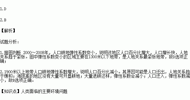 È˿ڸûµØµ¯ÐÔϵÊýÊÇ ÍÁµØÃæ»ý°Ù·Ö±ÈºÍÈ˿ڰٷֱÈÖ®±È£¬Ëü¿ÉÒÔºâÁ¿ÈË¿ÚÓë¸ûµØ¹ØÏµµÄ½ôÕų̶ȡ£ÏÂͼΪ¹óÖÝÎÚÃÉÉ½Çø¸÷º£°ÎµØ´ø2000¡¢2008ÄêÈ˿ڸûµØµ¯ÐÔϵÊý×´¿ö£¬¶Áͼ»Ø´ð¸÷Ìâ¡£
