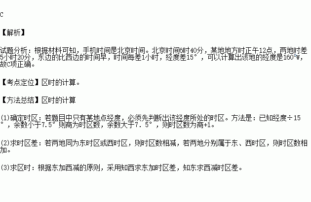 贾先生出国旅游随身带了一部全球通手机,但未改手机上的日期和时间,仍显示的是北京时间。贾先生游览到太平洋一小岛时,当地报时为正午12时,而手机上的时间为6时40分。该岛的经度为( )
