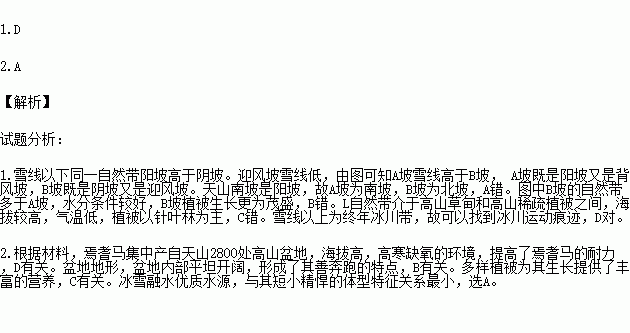 焉耆马是我国古代西域名马,体型较小,跋山涉水善奔跑,耐力好,这些特征与所处环境密切相关,焉耆马集中产自天山2800米处高山盆地。此盆地由三个U型谷组成。下图为我国天山自然带植被分布图,回答下列各题。