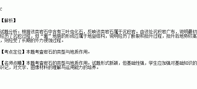 “岱崮地貌”(如下图)是山东沂蒙山区特有的一种地貌景观,过去在地貌学上称之为“方山”,该山岩石中普遍含有三叶虫化石。据此回答下题。