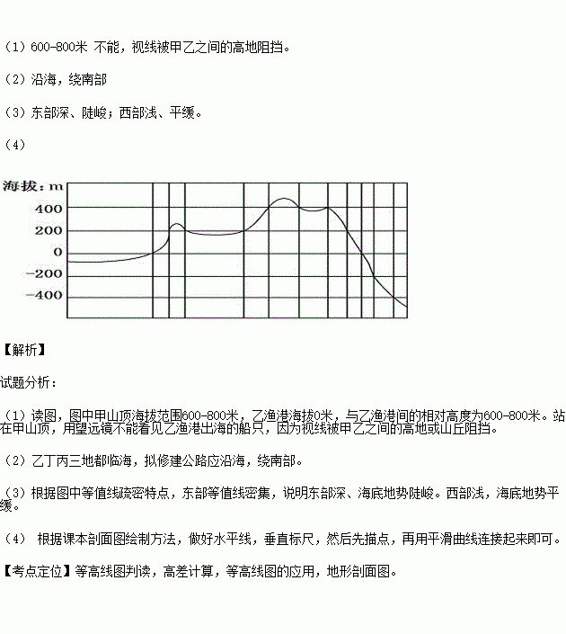 (1)图中甲山顶与乙渔港间的相对高度为 。站在甲山顶,用望远镜能否看见乙渔港出海的船只 。请说明能或不能的理由。