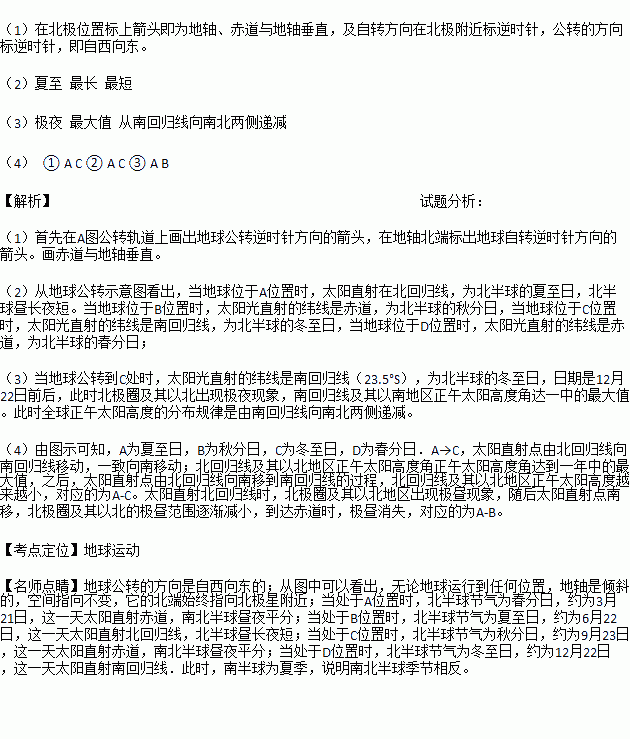 (2)当地球位于A处时,北半球的节气是 ,北半球昼 夜 。
