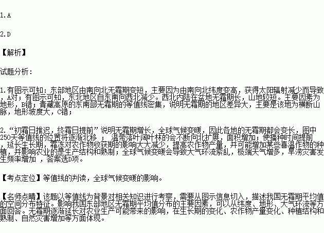 农业生产中将入秋以后,地面温度第一次和最后一次低于0℃的日期称为初霜日和终霜日,自终霜日到初霜日之间的天数称为无霜期,读我国无霜期平均值等值线(单住:天)分布图,分析回答下列各题。