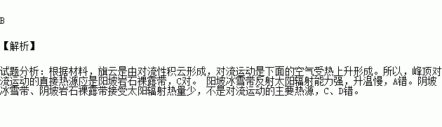 在天气晴朗时,珠峰顶常飘浮着形似旗帜的乳白色烟云,这就是珠峰旗云。旗云是由对流性积云形成,可根据其飘动的位置和高度,来推测封顶风力的大小,因此,珠峰旗云又有“世界上最高的风向标”之称。读下图,完成问题。