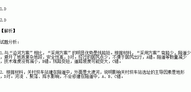 下图为成昆铁路一段选线设计图,有两个设计方案。“采用方案”较“沿河方案”短10km,减少曲线25个,减少车站一处,少修短隧道8座,绕避了地质复杂地段,且免受河流冲刷。其中关村坝车站建在隧道中,外面是滚滚的大渡河,成为车站中的奇迹。读图完成下列各题。