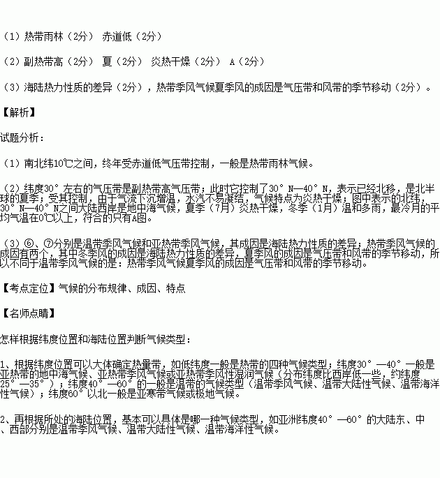 (3)图中⑥、⑦处,气候成因主要是 。热带季风气候与其成因不同的是 。