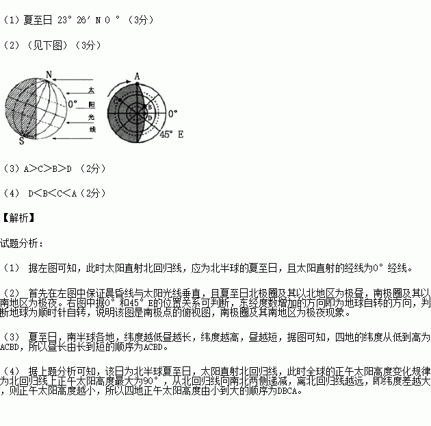 (4)A、B、C、D四地正午太阳高度由小到大排序为:__________。