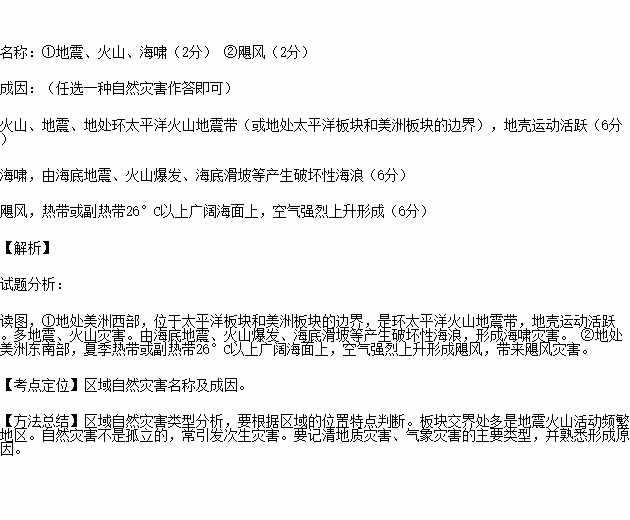 根据图文材料并结合所学知识,判断①和②自然灾害的名称,并选择一种自然灾害分析其成因。