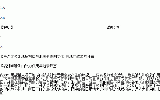 A. ①处山岭是地壳水平挤压褶皱隆起而形成的