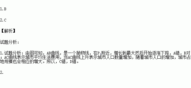 读“城市规模的成本效益曲线图”,其能够反映出城市的最佳规模或合理规模。AB是平均效益曲线,AC是城市平均生活费用曲线。完成下列问题。