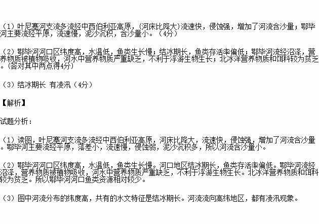 (1)分析叶尼塞河泥沙含量较多,而鄂毕河泥沙含量较少的原因。(4分)
