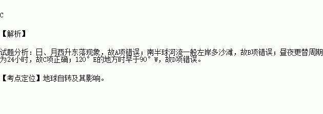 C.昼夜更替周期为24小时 D.120°E的地方时晚于90°W