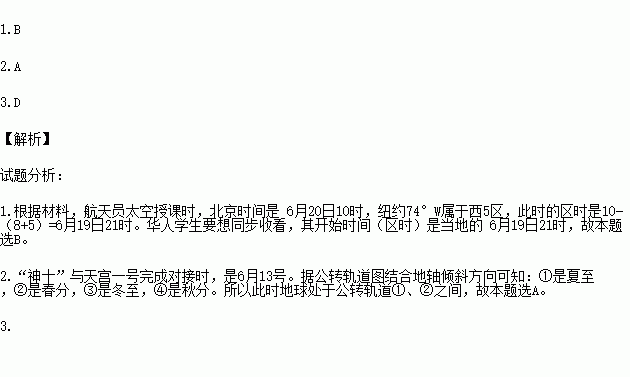 1.航天员太空授课时,位于纽约(40°43′N 74°W)的华人学生要想同步收看,其开始时间(区时)是当地的( )