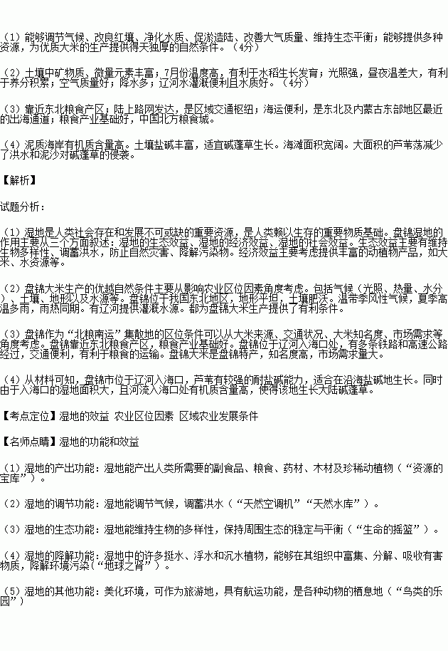 材料二 辽宁盘锦地处辽河下游,渤海之滨,辽河三角洲核心地带,地面覆盖着深厚的淤积物,是在河流冲积和海洋沉积交替作用下形成的特殊地表,构成了滨海湿地复合生态系统。盘锦被称为“湿地之都”,其湿地面积3150平方公里,占全市总面积80%。良好的生态环境孕育了优质生态的稻米,铸就出中国名牌——“盘锦大米”。盘锦是“北粮南运”的集散地,被称为“中国北方粮食城”,它正在建设现代化的粮油交易物流中心,将把整个东北和蒙东地区,甚至北方14省的粮油商流、物流、信息流和旅游客流有机地结合在一起。