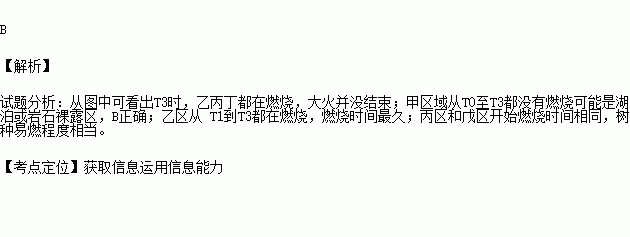 下图是通过GIS工具将某地区一次森林大火事件T0至T3等四个时间卫星影像,加以分析绘制成的森林大火燃烧示意图。 从该地区森林大火燃烧情况推断,下列最为合理的是( )