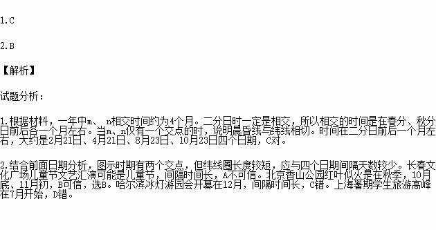 ÏÂͼÖÐmΪγÏßȦµÄÒ»²¿·Ö£¬nΪ³¿»èȦµÄÒ»²¿·Ö£¬Ò»ÄêÖÐm¡¢ nÏཻʱ¼äԼΪ4¸öÔ¡£¶ÁͼÍê³ÉÏÂÁи÷Ìâ¡£