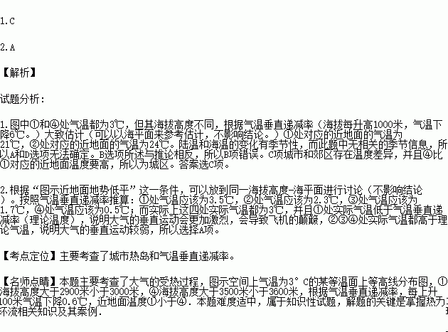 2.若图示近地面地势低平,气温都为21.5°C。则飞机在图中①、②、③、④四处飞行飞行员感觉最颠簸的是
