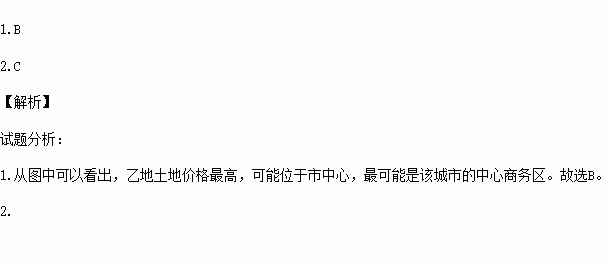某城市东西相距25千米,甲、乙、丙、丁分别表示该城市不同的区域。下图为该城市沿东西方向“人口密度与土地价格分布曲线图”。回答下列问题。