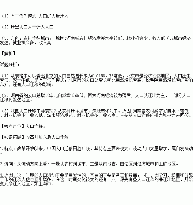 (1)材料反映的北京市人口增长模式为__________________。北京市的人口总增长率比自然增长率高,其原因是________________________________________________________________。