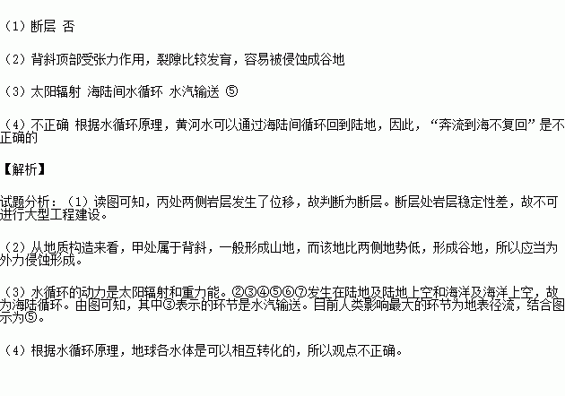 (1)从地质构造看,丙处属于 ,该处能否进行大型工程建设? (能/否)