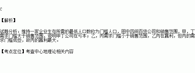 维持一家企业生存所需的最低人口数称为门槛人口。图是某地区同一类型四间百货公司的需求门槛和销售范围之间的关系示意图。赢利最大的公司是