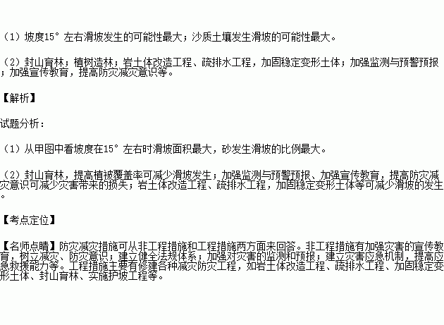 (1)据图说明该区域什么坡度、土质发生滑坡可能性最大?