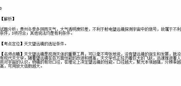 ÎÒ¹úÕýÔÚ¹óÖݽ¨ÉèÊÀ½ç×î´óÉäµçÍûÔ¶¾µ¡£ÉäµçÍûÔ¶¾µµÄÐÎ×´±¾Éí¾ÍÏñÒ»¿Ú´ó¹ø£¬¸ÕºÃÄÜÎÈÎȵؼÜÔÚɽÖУ¬ÍûÔ¶¾µµÄÖ÷ҪĿ±êÊÇҪ̽²âÓîÖæÖеÄÒ£Ô¶ÐźźÍÎïÖÊ¡£ÍûÔ¶¾µÑ¡Ö·ÓÚ¹óÖÝÊ¡ÇÄÏÖÝÆ½ÌÁÏØµÄÃû½Ð¡°´óÎÑÛÊ¡±µÄ¿¦Ë¹ÌØÍݵأ¬¾àÀë¹óÑôÊÐ160-170¹«Àѡַ¸½½üûÓлùÕ¾£¬Ò²²»ÔÊÐíʹÓÃÊÖ»ú£¬ÒòΪÕâЩÐźŶ¼ÒªÔ¶Ô¶Ç¿ÓÚÀ´×ÔÓîÖæµÄÐźţ¬ÕâÀïÖ»ÄÜͨ¹ý¹Ì¶¨µç»°ºÍÍâ½çÁªÂ硣ͼ1ºÍͼ2·Ö±ðÊÇÕýÔÚ½¨ÉèºÍÍ깤ºóµÄÍûÔ¶¾µÍ¼¡£ÏÂÃæ¹ØÓÚÑ¡Ôñ¹óÖÝ¿¦Ë¹ÌØÍݵØ×÷ΪÉäµçÍûÔ¶¾µÑ¡Ö·ÔÒòµÄÐðÊö£¬ÆäÖÐÊôÓÚ²»ÀûÌõ¼þµÄÊÇ£¨ £©