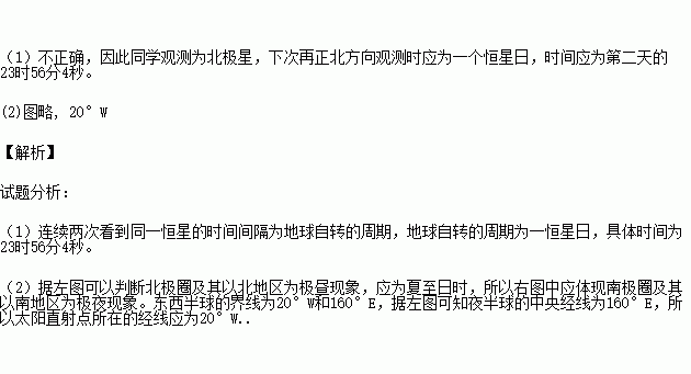 (1)他们认为:在一个窗户朝正北的房间里,当地时间24时第二天看到北极星位置和前一天是一致。你认为是否正确?(1分)为什么?(3分) | |