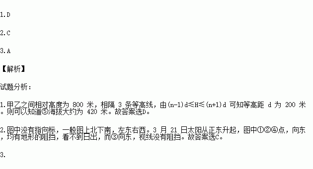 下图为某地等高线示意图。某地理兴趣小组3月21日在图示地区宿营。甲乙两地的相对高度为800米。据此回答以下各题。