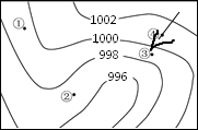 分析:此题考查的是天气系统的气压系统.等压线图从外向内,数值逐渐减小,所以是低压系统,故④风向是东北风.如图: