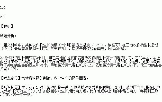 某种农作物生长期约3个月,前期(2个月)最适宜的温度17-22°C,后期(1个月)最适宜温度12-14 °C。下图是种植该作物的甲、乙两地气温资料。读图,回答下列问题。