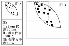 试题分析:“将图A放大成图B,地图所表达的内容不变”,说明只是比例尺发生了变化(实际距离不变,而图幅变大,比例尺变大),图幅面积变为原来的四倍,即比例尺为原来的两倍,为1:500000,图上1厘米代表实际距离5千米,每点还是代表1000人,人口密度不会变。故说法正确的只有④一项,其他三项错误。