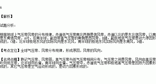 A.赤道低气压带南北两侧是信风带