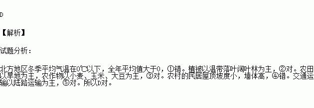 ①全年平均气温在0℃以下 ②植被以温带落叶阔叶林为主 ③农田以旱地为主,农作物以小麦、玉米、大豆为主 ④农村的民居屋顶坡度大,墙体高 ⑤交通运输以陆路运输为主