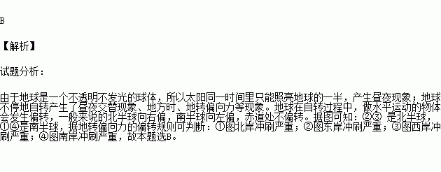 ①北半球自西向东,南半球自东向西 ②南北半球都是自西向东 ③从北极上空看,地球逆时针自西向东自转 ④从南极上空看,地球顺时针自东向西自转