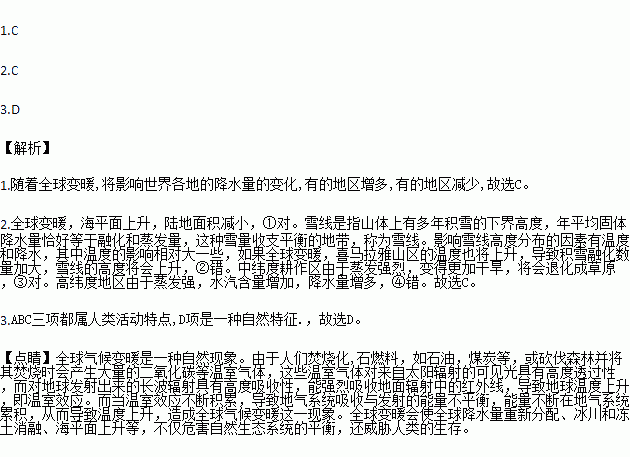 ¢ÙÈ«Çò½µØÃæ»ýËõС¡¡¢ÚϲÂíÀÑÅɽѩÏß½µµÍ¡¡¢ÛÖÐγ¶È¸û×÷Çø½«»áÍË»¯³É²ÝÔ¡¡¢Ü¸ßγ¶ÈµØÇøÒò±äů¶øÕô·¢¼ÓÇ¿£¬±ÈÔÀ´½µË®¸üÉÙ