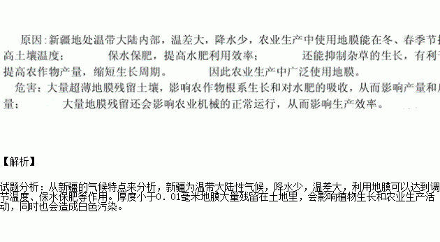 根据所学知识分析说明新疆农业生产中广泛使用地膜的原因。厚度小于0.01毫米地膜大量残留在土地里,有什么危害?