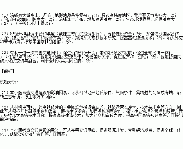 材料二:据媒体分析,修建这些国际高铁至少面临以下三个方面的挑战:一是巨额资金难以筹集。修建欧亚高铁所需资金将是一个天文数字,绝非中国一国政府可以承担;二是铁路运营将是一个难题。高铁要穿越多个国家,如何管理和运营这条跨国高速铁路系统将是一个巨大挑战;三是技术难题仍无法解决。中俄加美高铁建设在技术上将面临巨大挑战。