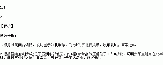 2.考虑海陆分布等实际情况,此季节b处的气候特征是