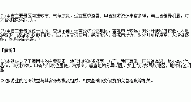 (1)每年夏季乙省有大量游客前往甲省旅游,分析其原因。