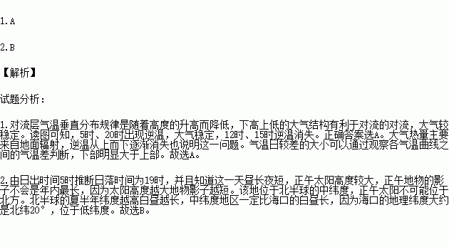 图为北半球中纬度某地某日5次观测到的近地面气温垂直分布示意图。当日天气晴朗,日出时间为5时。读图回答下列问题。